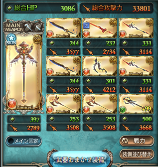 竹槍も入れてみましたが、タウルスのほうがダメージでました。とはいえタウルスじゃなくてもデビル拳とかなんでもいいので上限盛ってあげればいいです。朱雀刀でもOK。イクサバ入れなくても火力面は問題ありません。リミゼタ槍二本目未所持なので、そっちのほうがいいかはわからないです(理想はリミゼタ槍3本ぽい)。