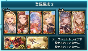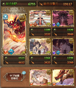 上記編成。サンQ召喚、シークレットトライアド、パー3の編成。TAでダメージはぶれますが、非有理でも1.6億とか、有利だと2億とかでたりもします。