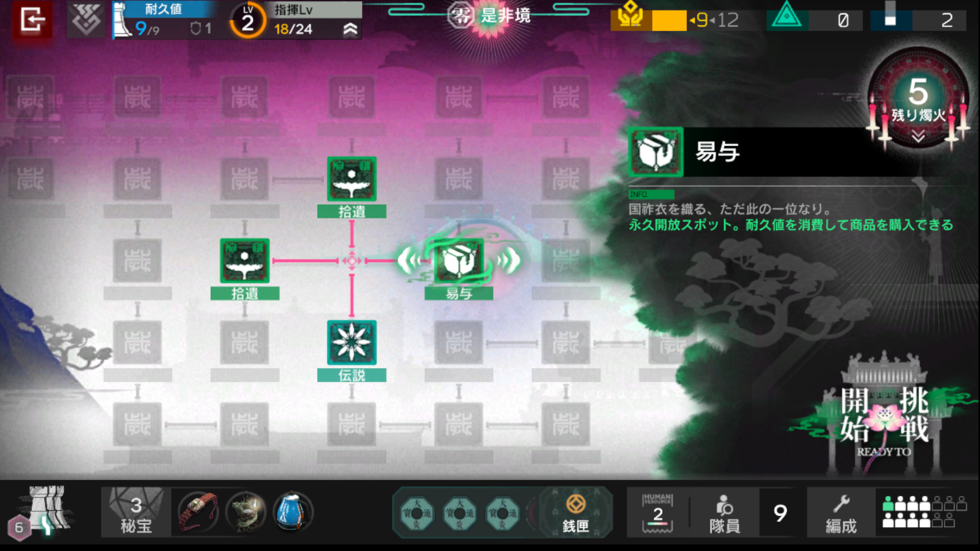 異境の中には耐久値回復スポットも結構あるので、秘宝で耐久値を使う→回復の流れがおすすめ。ただし、もし捨遺が最大耐久値が伸びると書かれていたら、先にそっちに入っておくのがおすすめ。回復は減った耐久値を文字通り回復ですが、最大耐久値が伸ばせればお金が増えたのと同じ意味です。