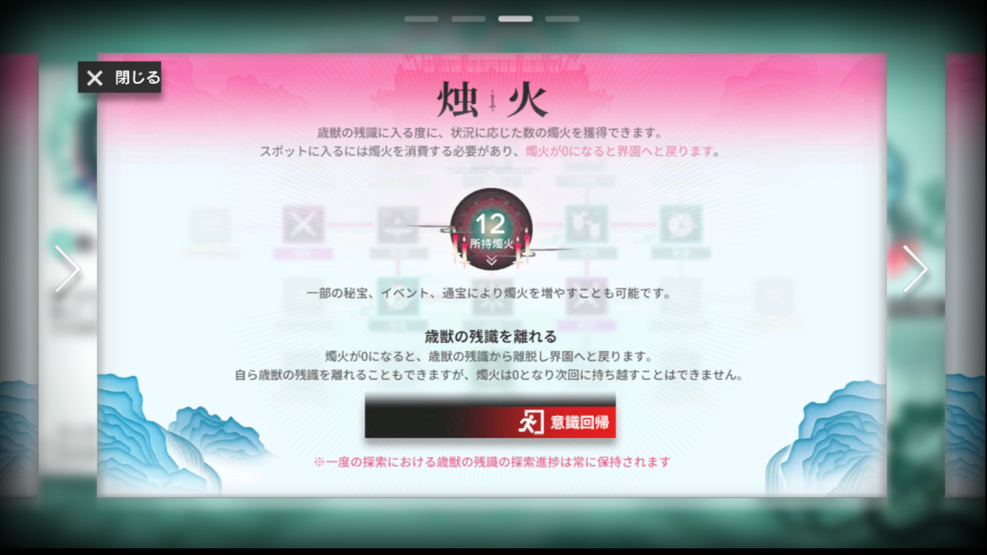 歳獣の残識は歳ローグライクのメインコンテンツとなるもので、特殊な燭火というスタックを消費して進みます。