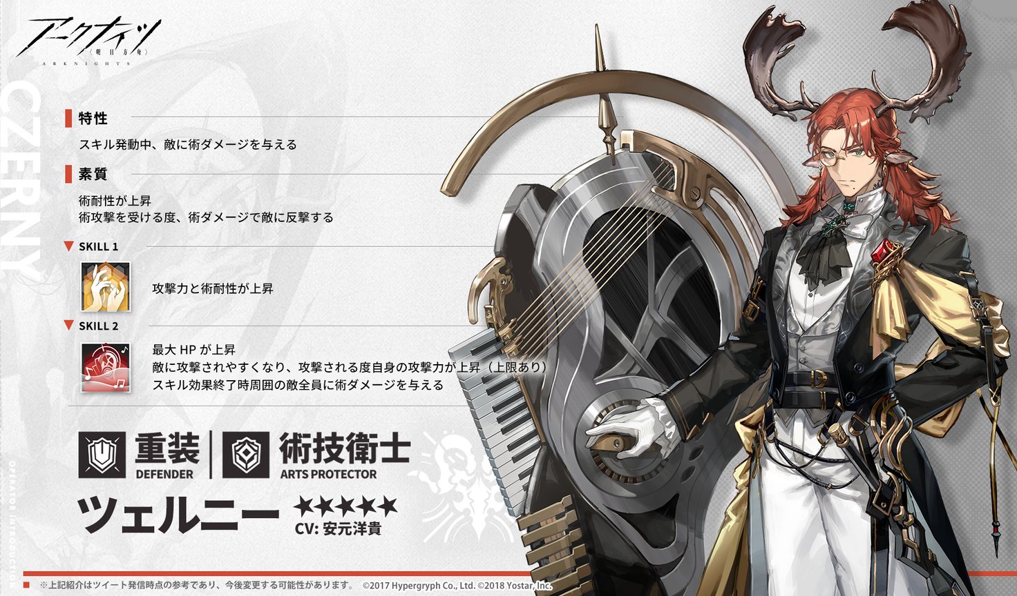 | 3 | HP+275 防御力+57 | 素質「エコー」更新 術耐性+10、術攻撃を受ける度ツェルニーの攻撃力の110%[+25%]の術ダメージで敵に反撃 |
