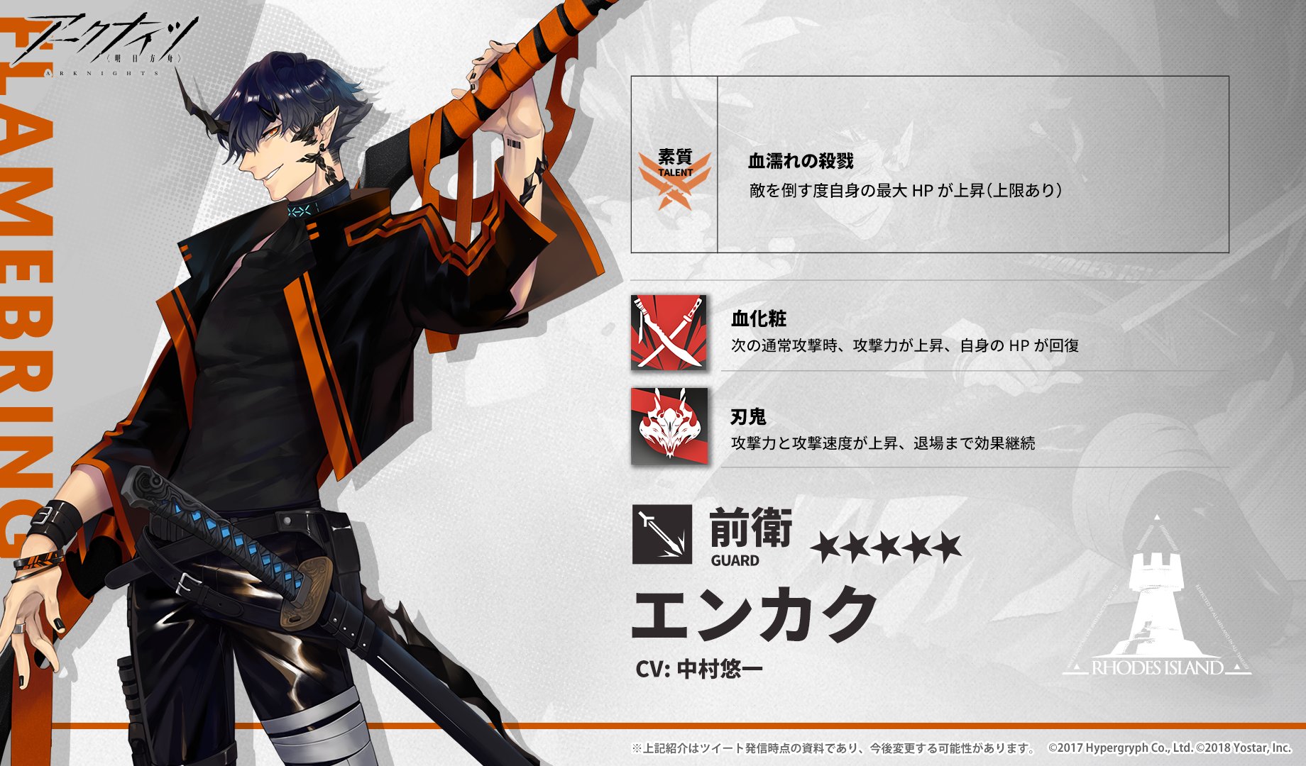 | 2 | HP+370 攻撃速度+5 | 素質「血濡れの殺戮」更新 周囲4マス内で敵が倒れる度自身の最大HPが60[+20]上昇、最大30回まで |