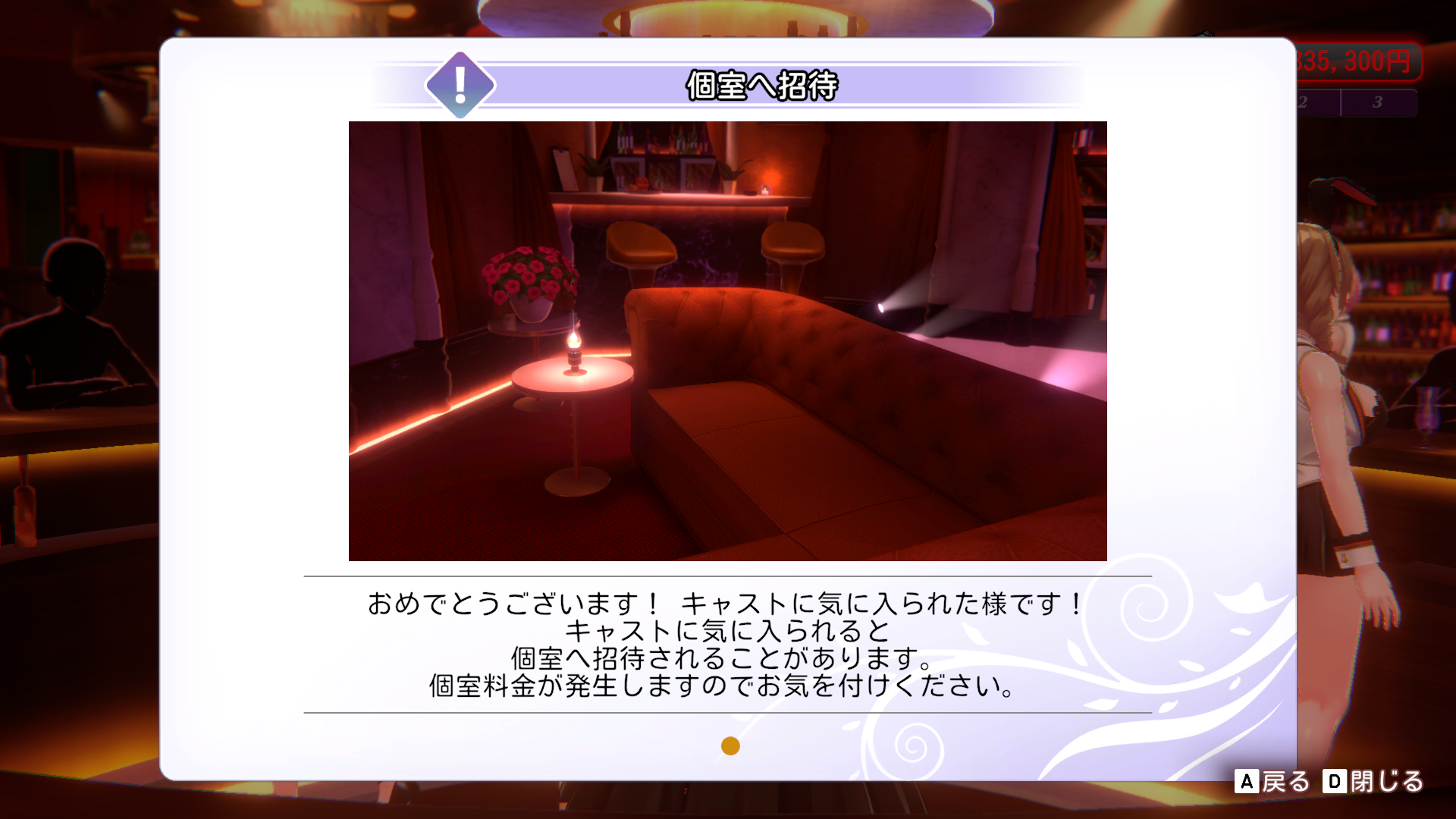 個室は好感度が2.5以上で案内されるように。ヨウマンド連打してるとめちゃくちゃ序盤でもすぐ個室に行けます。