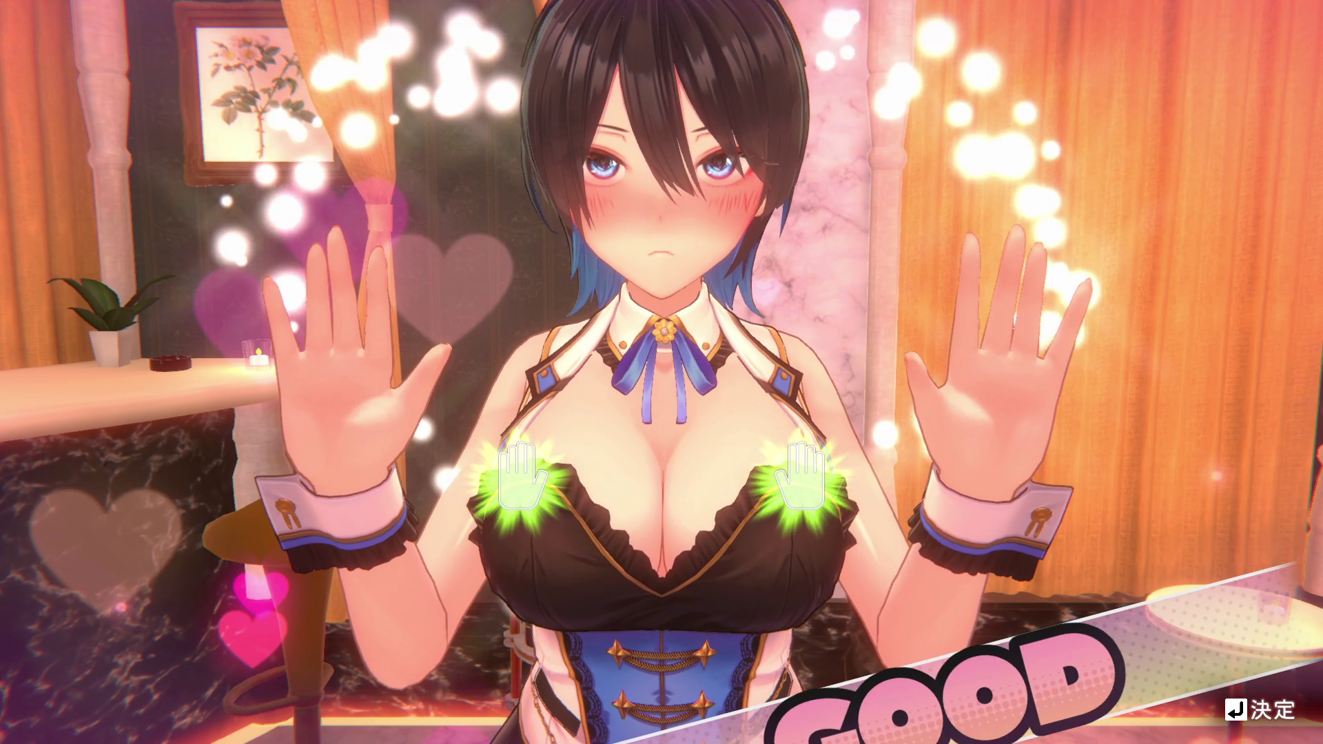 手押し相撲はちょうど手が合わさったときにボタンを押すと成功します。女の子が酔っ払っていると2回で勝利できる一方、酔っ払っていないとどんどんタイミングも速くなって合わせづらくなるだけじゃなく、5回やらないと勝てないので、基本は酔っ払ったときにやりましょう。