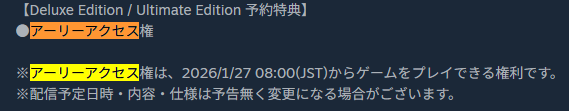 調べてみたところ、動画でもSteam版のアーリーアクセスの明確な時間はありませんでした。ただし、8時から遊べること、Steamの公式ページでフルリリースの三日前になっていること、Steam内でも1/27となっているので、恐らくその時刻から開始です。