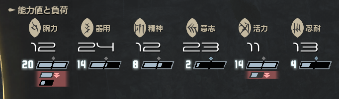 今回の場合だと20、14、8、2、14、4となっており、腕力と活力が溢れて過剰負荷状態になっています。余談ですがローリングはこのキャパシティを全て半分以下になっているときに可能です。なので6、12、6というような感じなのでステップ回避は条件かなりキツめ。