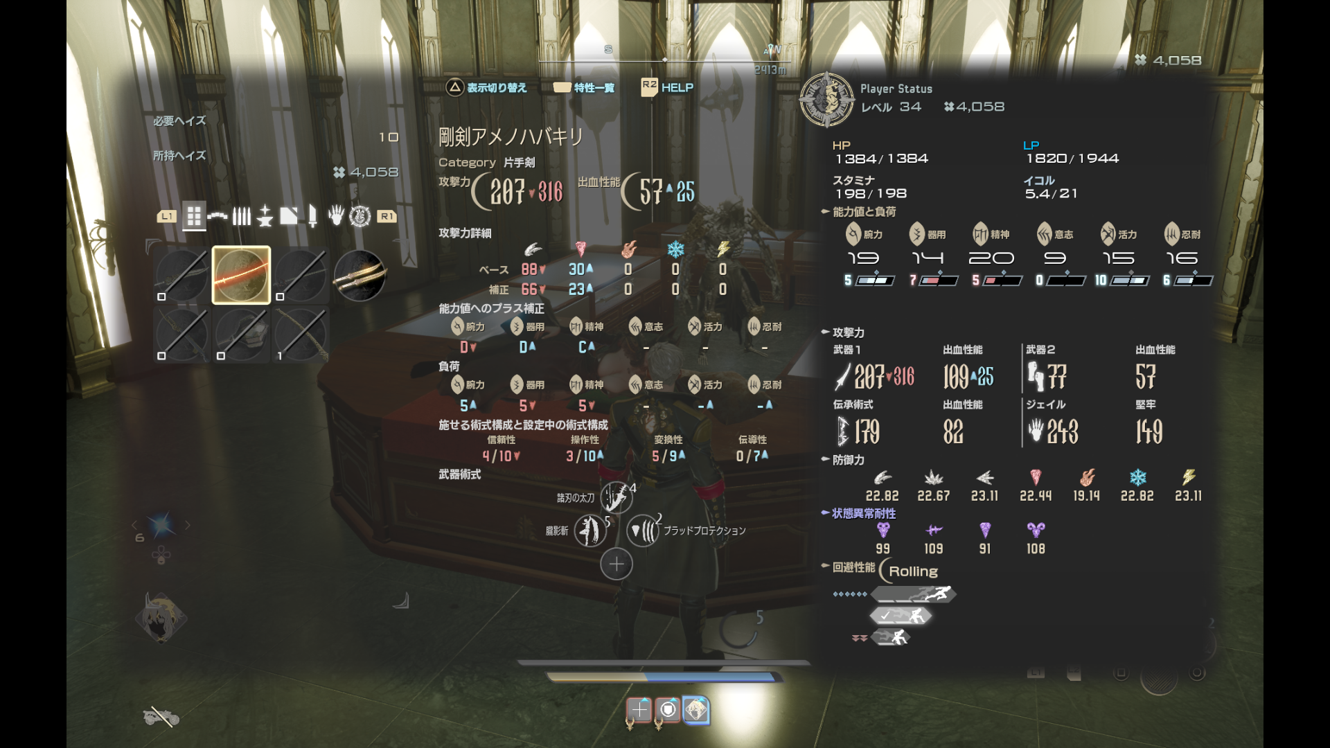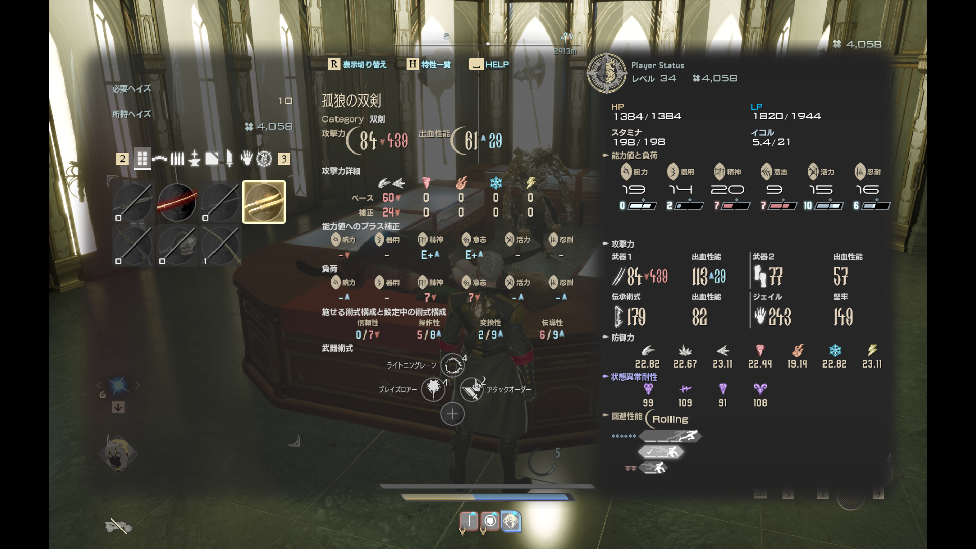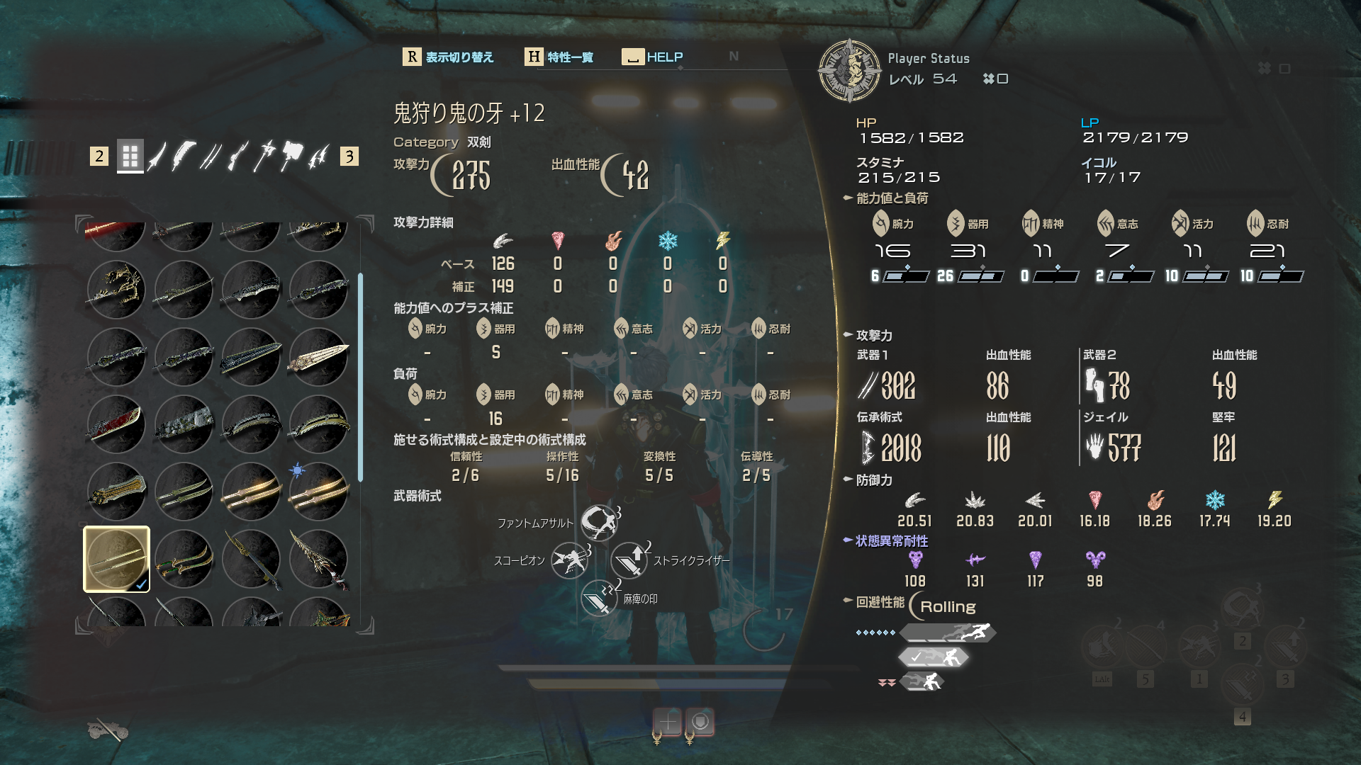 最初は斧槍のほうが強いなーと思っていて、実際斧槍のリーチの長さとかは今でも優秀だと思ってはいますが、回避を中ロリからステップに変更してみたらリーチの短さはあまり気になりませんでした。あと朧影斬が突っ込める技なのもあって、さらにリーチは気にならなくなりますね。