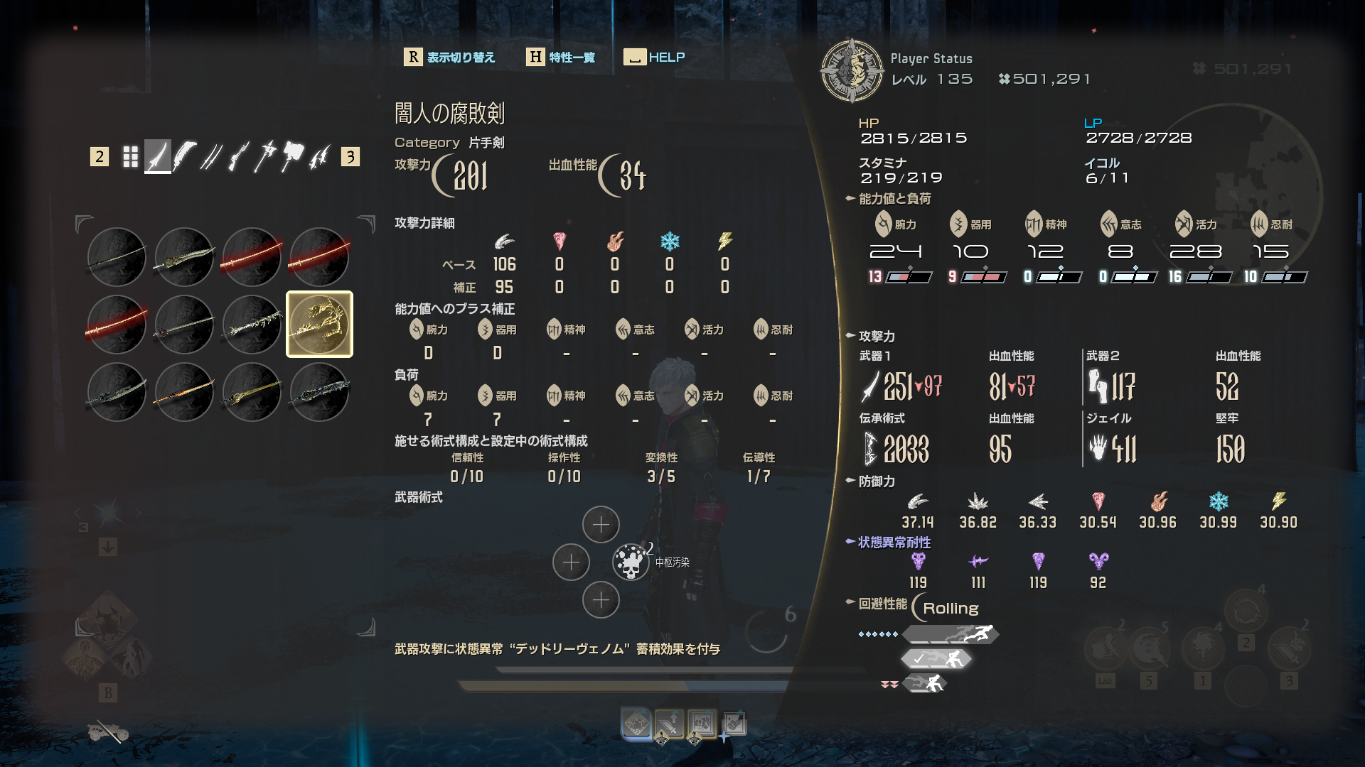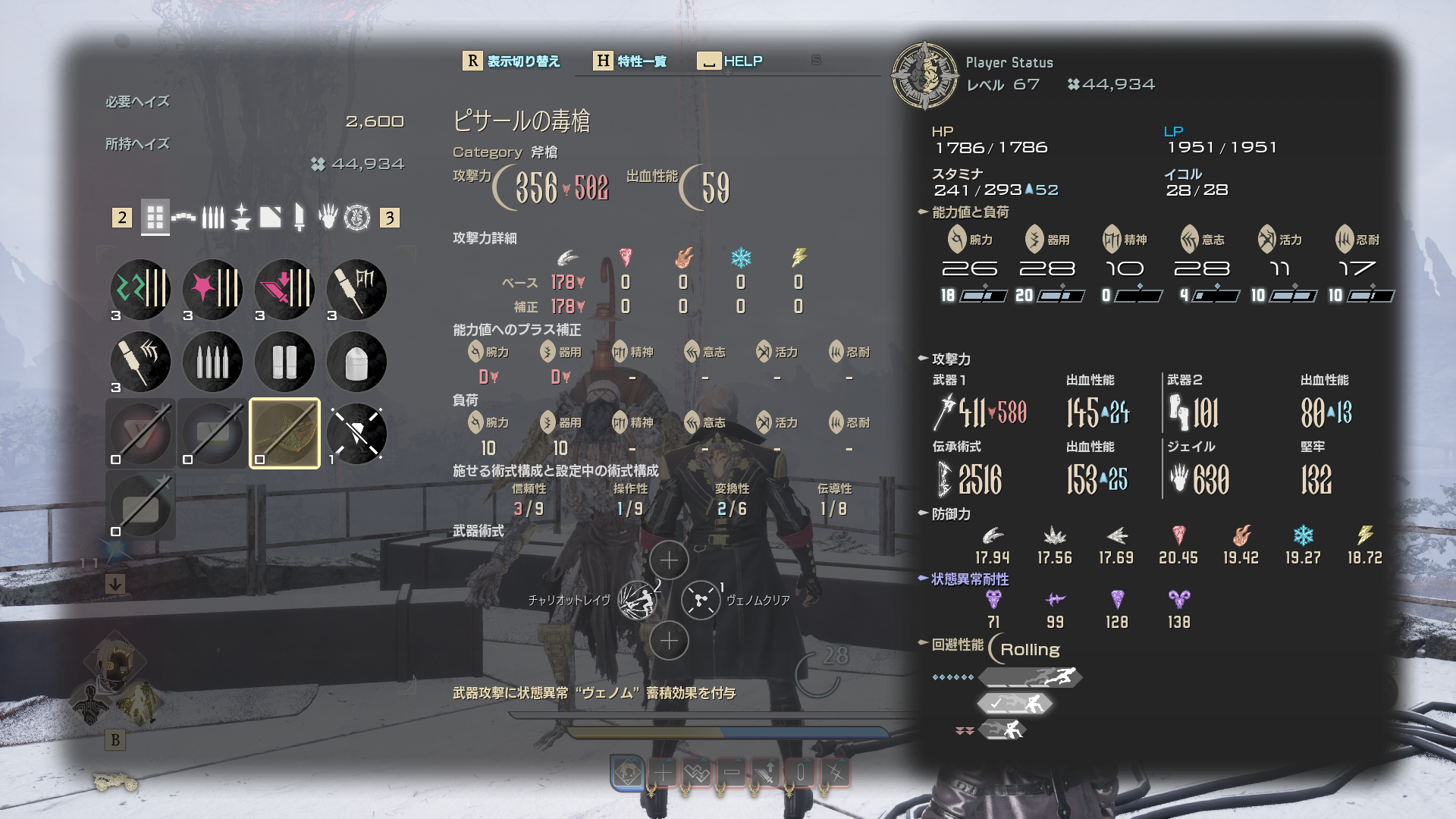 他にも毒系の状態異常武器はあるのでそれも強いかもですが、個人的に扱いやすかったのがピサールの毒槍。毒の状態異常自体もそこそこ強いですが、斧槍はモーションが結構優秀なのと、術技が扱いやすかったです。韋駄天突きが特に優秀。他は今のところ個人的にはぱっとしません。