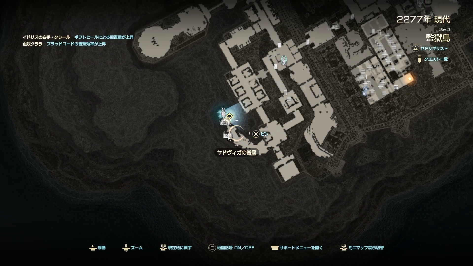 心臓の骸4は監獄島ダンジョン内にいる眷属から購入します。この近くにはヤドリギもないので、上のマップを参考に向かって、かつ一回で買えるように最低でも17160ヘイズは用意しておきましょう。