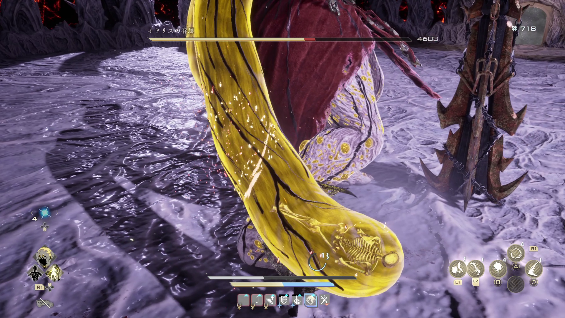 近づきすぎると後ろのうにょうにょに捕獲されます。正直これ、対策しようにもめちゃくちゃモーションが速くて、とりあえず近いと捕獲攻撃がくるな、という理解するしかないくらい強力行動です。