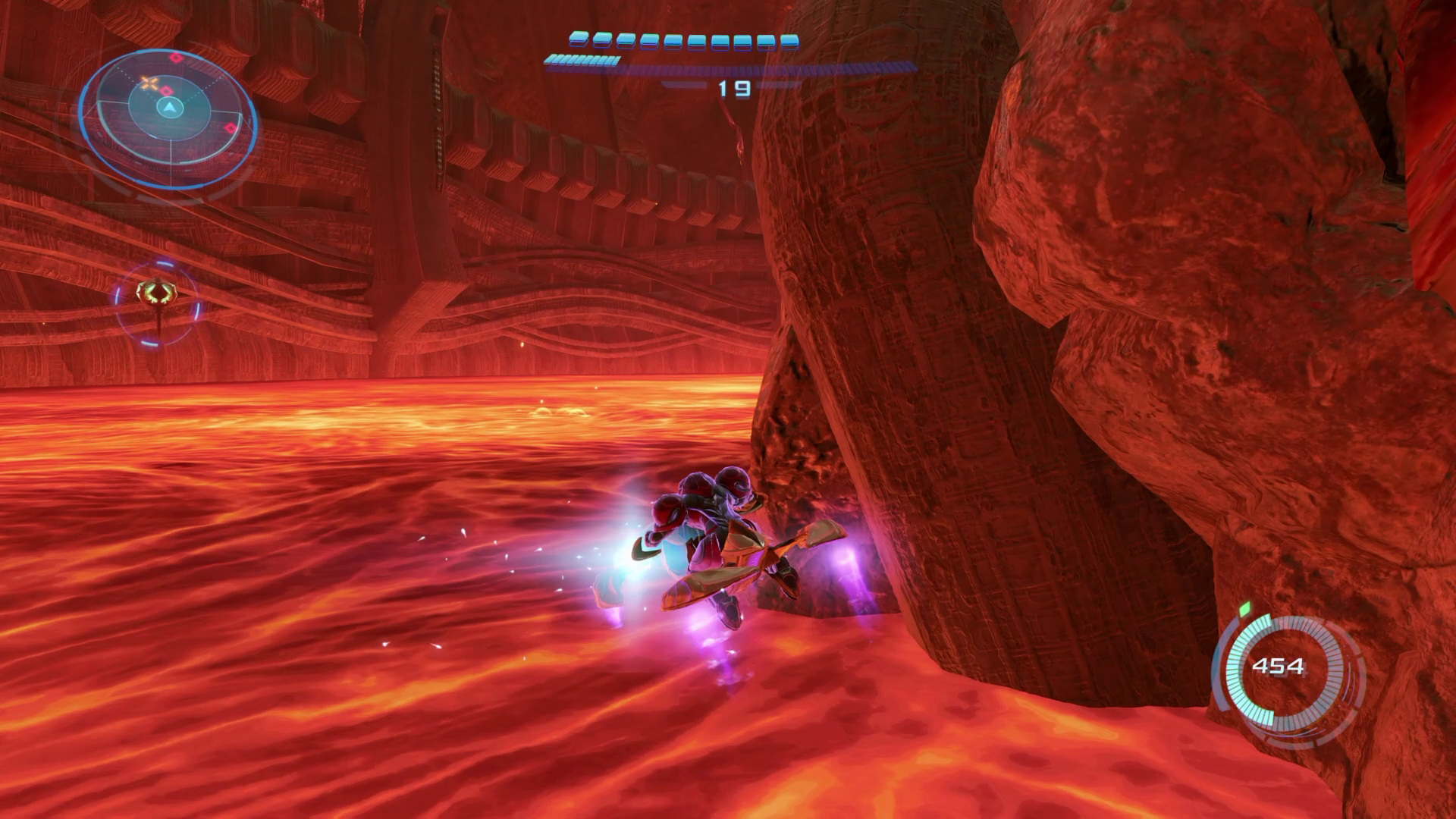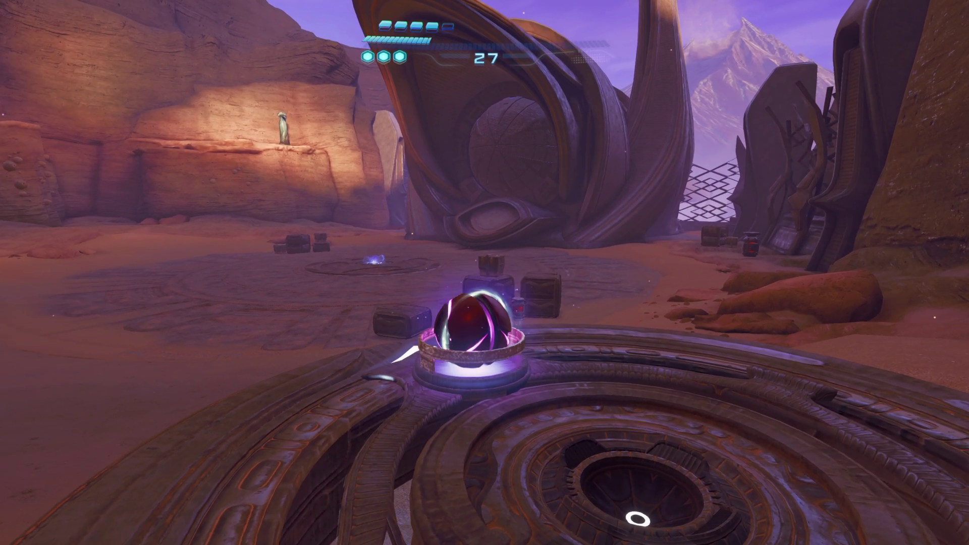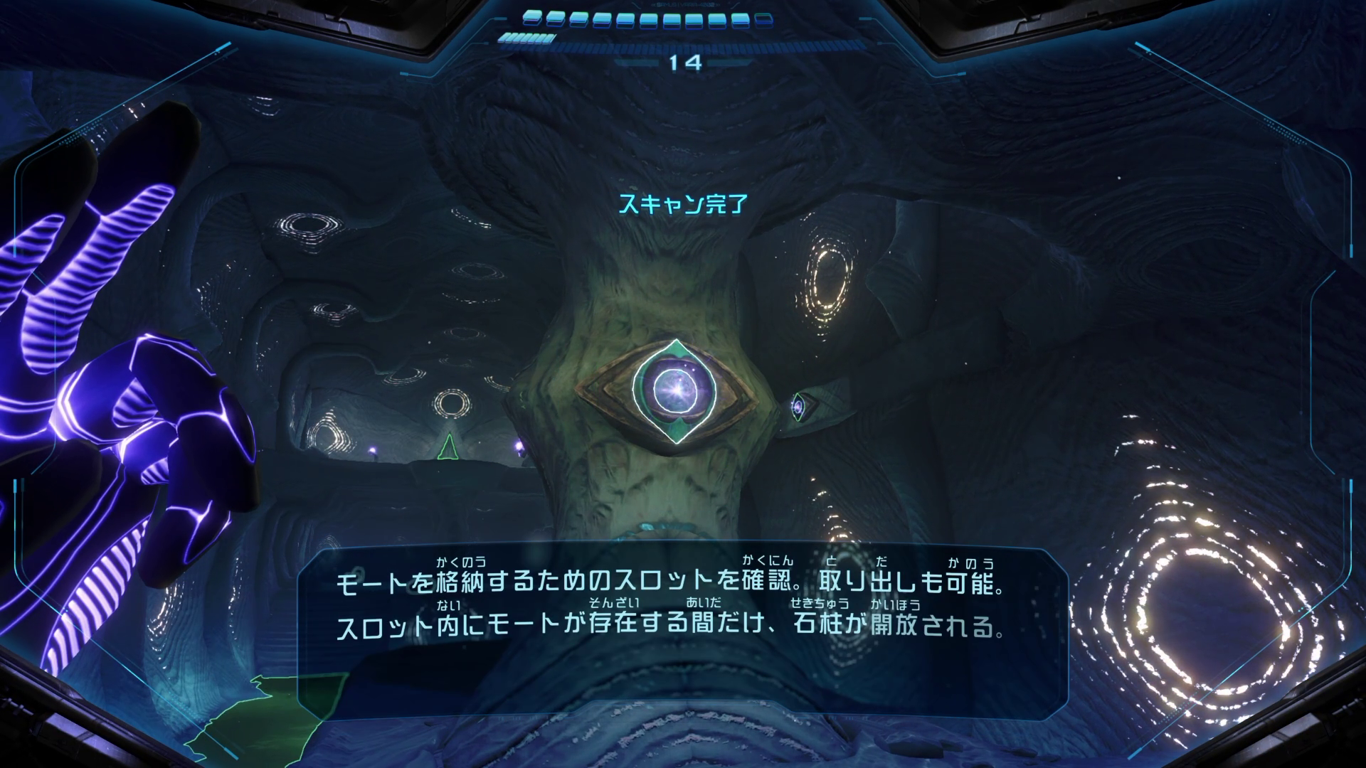 ボール状態でダッシュできるようになったら、火山の入口のすぐ右側でボール状態でダッシュすると飛ばされます。飛んだ先にラージショットタンクが落ちているので回収しましょう。その先のラモンの石像をスキャンすると世界観の説明してくれます。