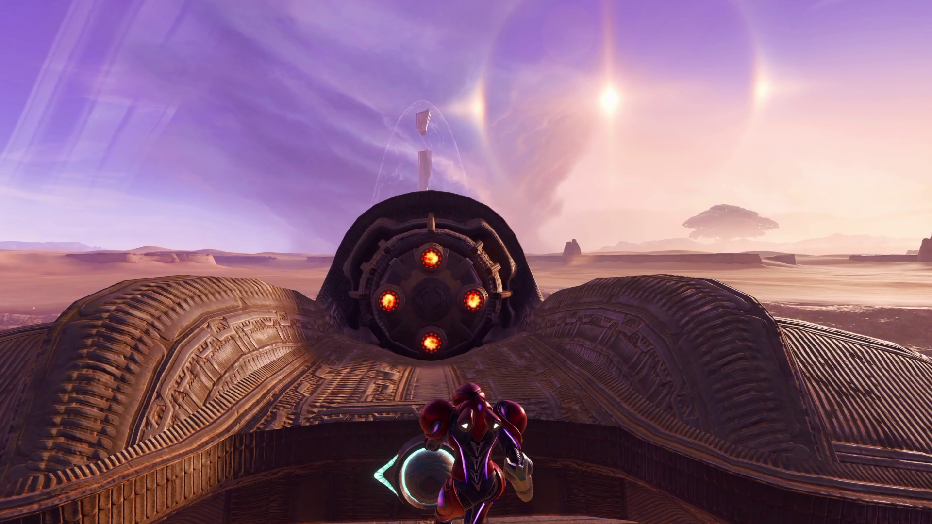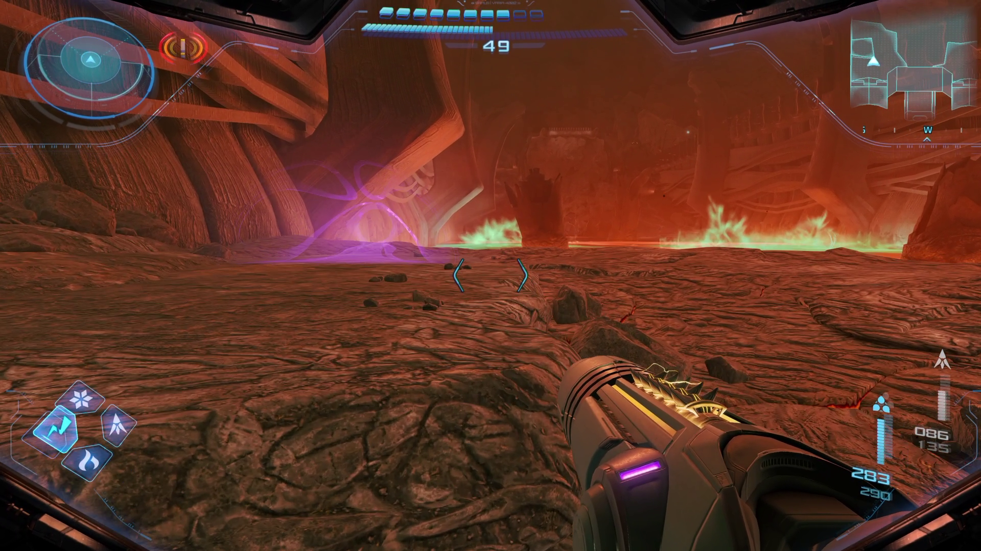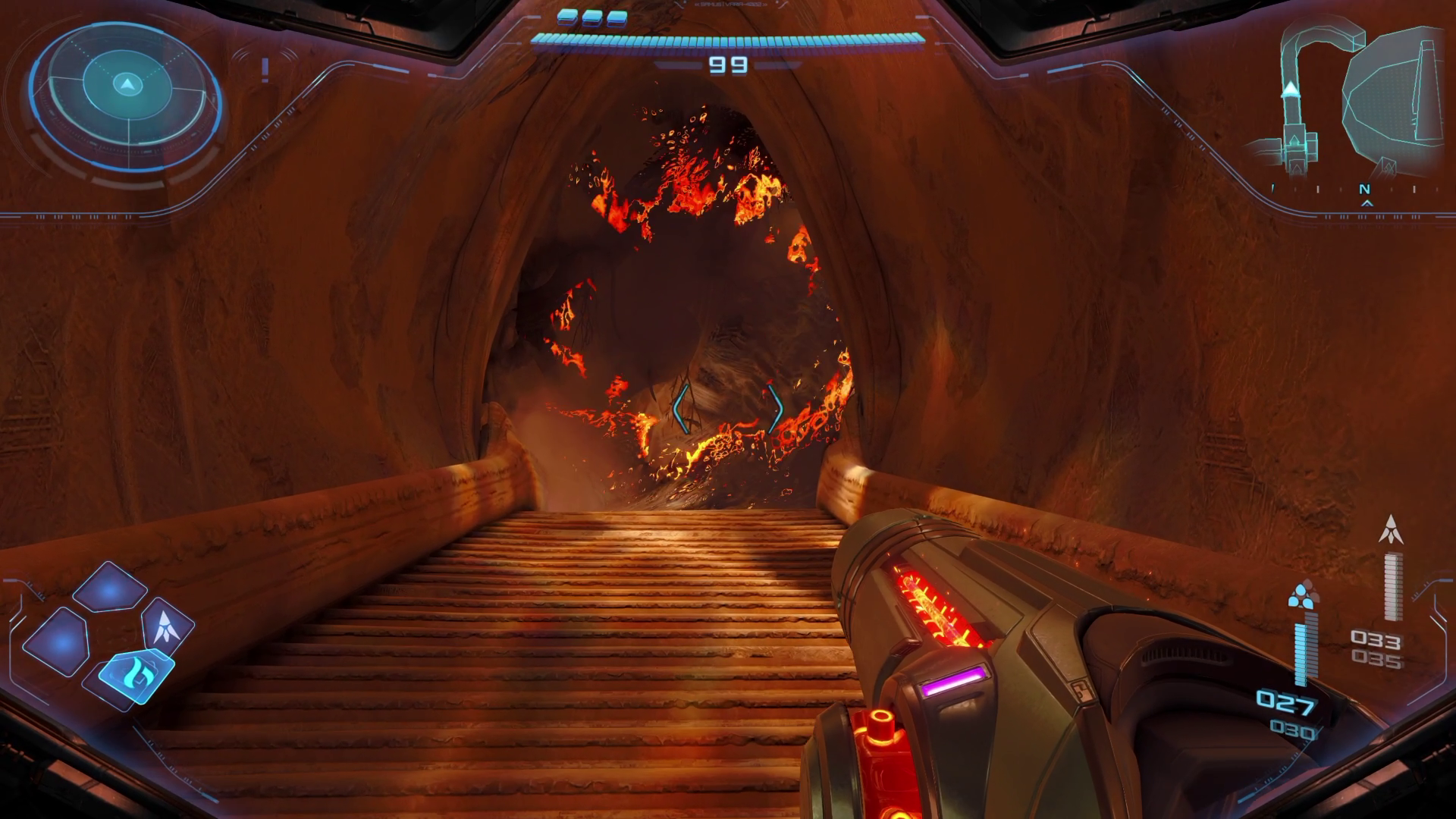 ボール状態でダッシュできるようになったら、火山の入口のすぐ右側でボール状態でダッシュすると飛ばされます。飛んだ先にラージショットタンクが落ちているので回収しましょう。その先のラモンの石像をスキャンすると世界観の説明してくれます。