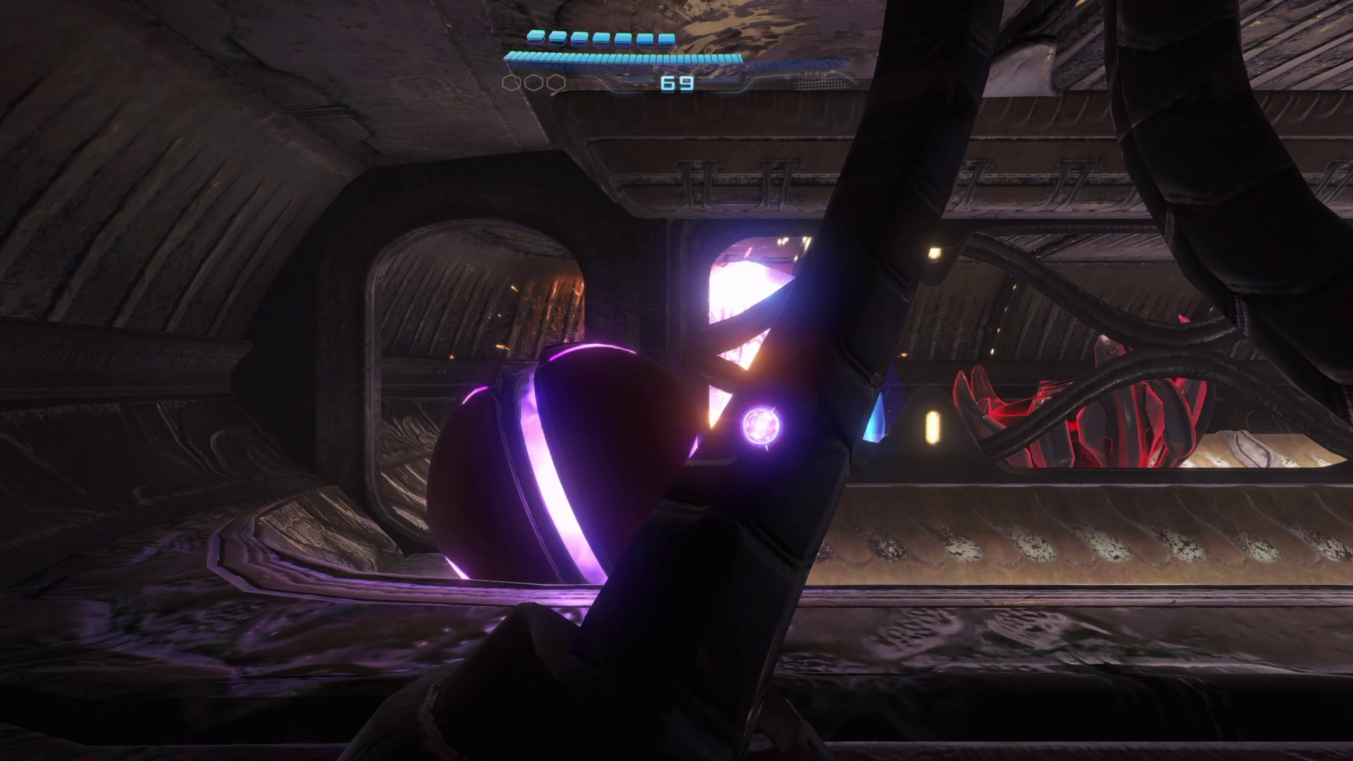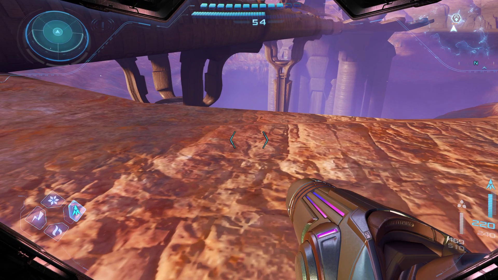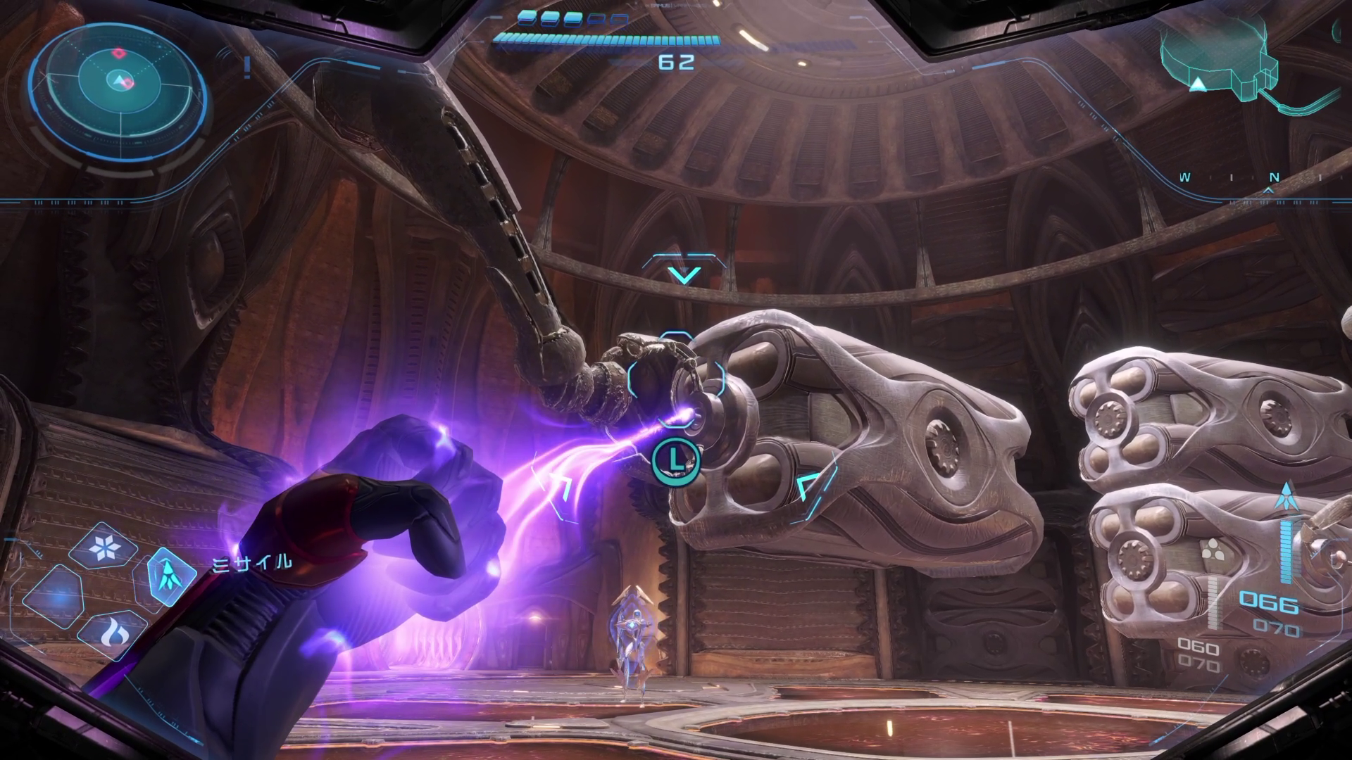 入口のスパイダーで登れる場所の上にショットタンクが見えます。このショットタンクは反対側から見るとグラップルで登れて、スーパーミサイルで破壊できるオブジェクトがあるので、破壊してボールで進めば入手。