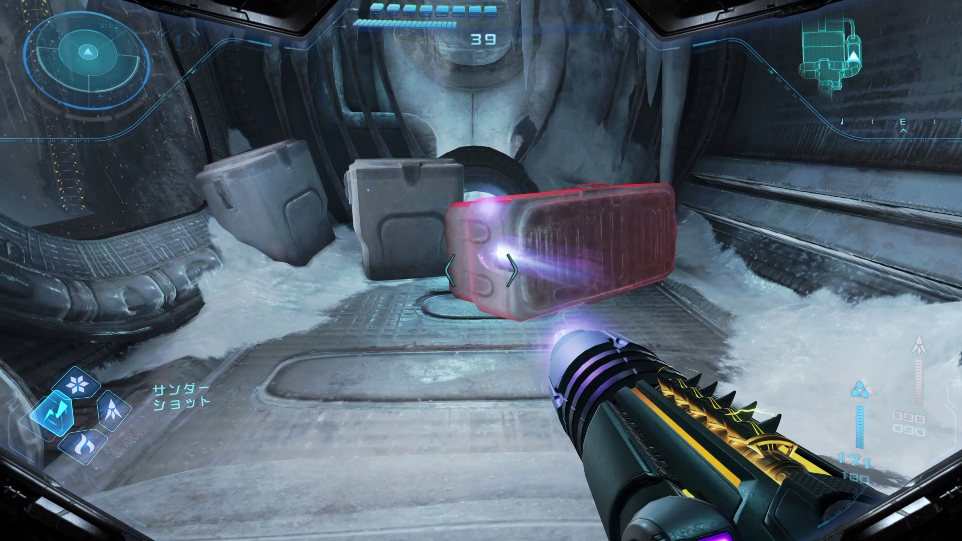 アイスベルトへ。なかに入ったら、最初の広間(オレンジがかっている)場所でサンダーショットを使って先へ