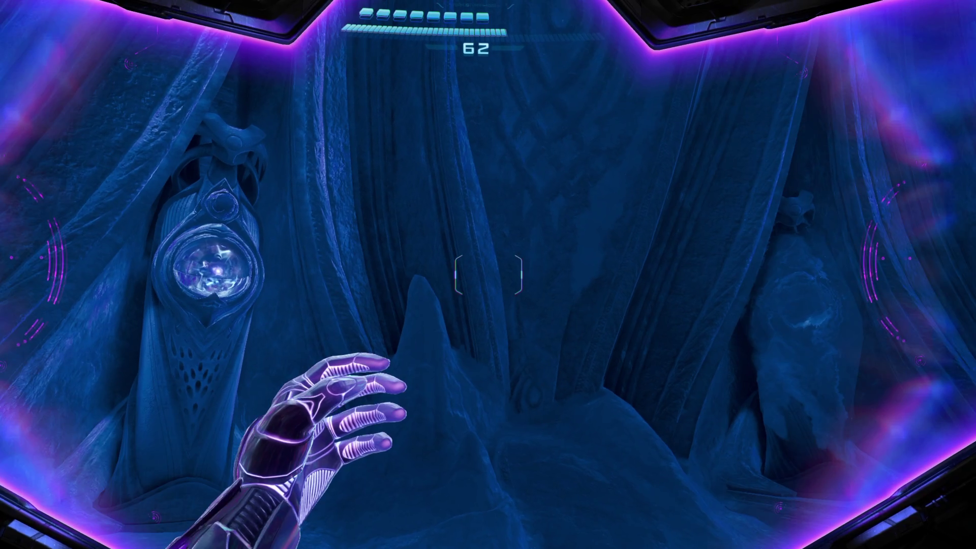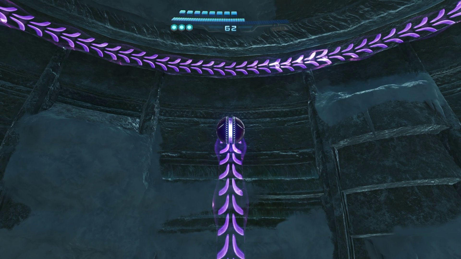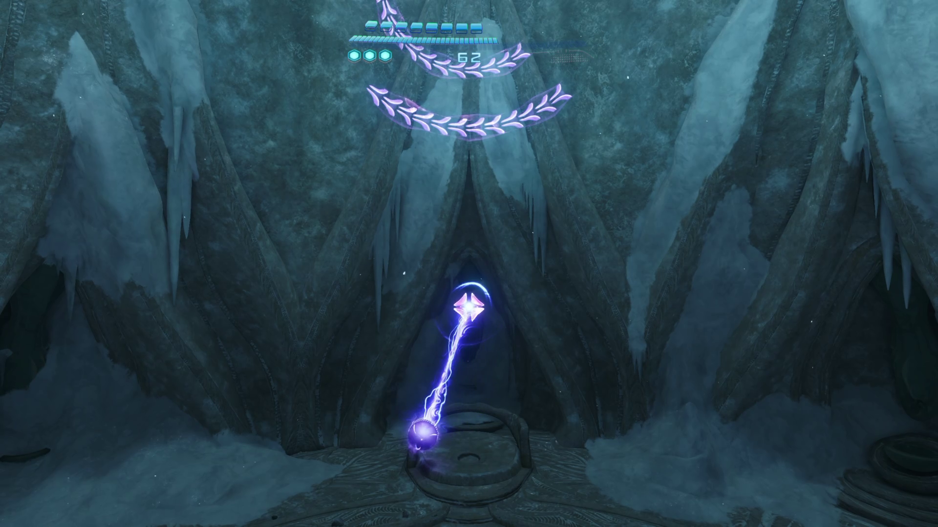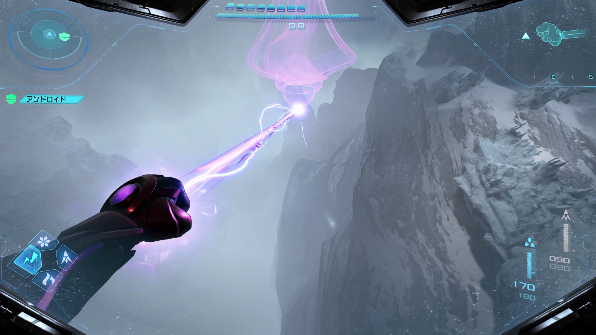 グラップルで先に向かう。ここでは風が定期的に吹いてきて、そのたびにサムスの向きを移動させないといけない。めんどくさがらずに風がやむのを待って、グラップル3つ目まで一気に飛ぶのがおすすめ。
