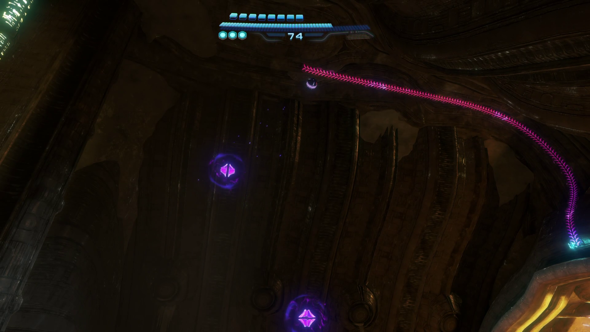 入ってすぐの広い広間でボール状態で奥まで進むとジャンプしてZLで掴まれるエリアがあります。最初のに捕まるのにジャンプでもいけますが、少し遠いのでジャンプボムで高さを確保してやると簡単にZLで掴まれます。