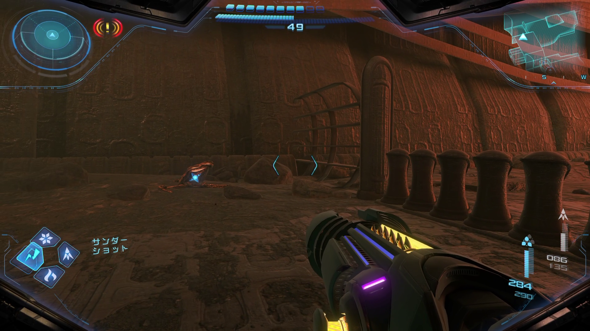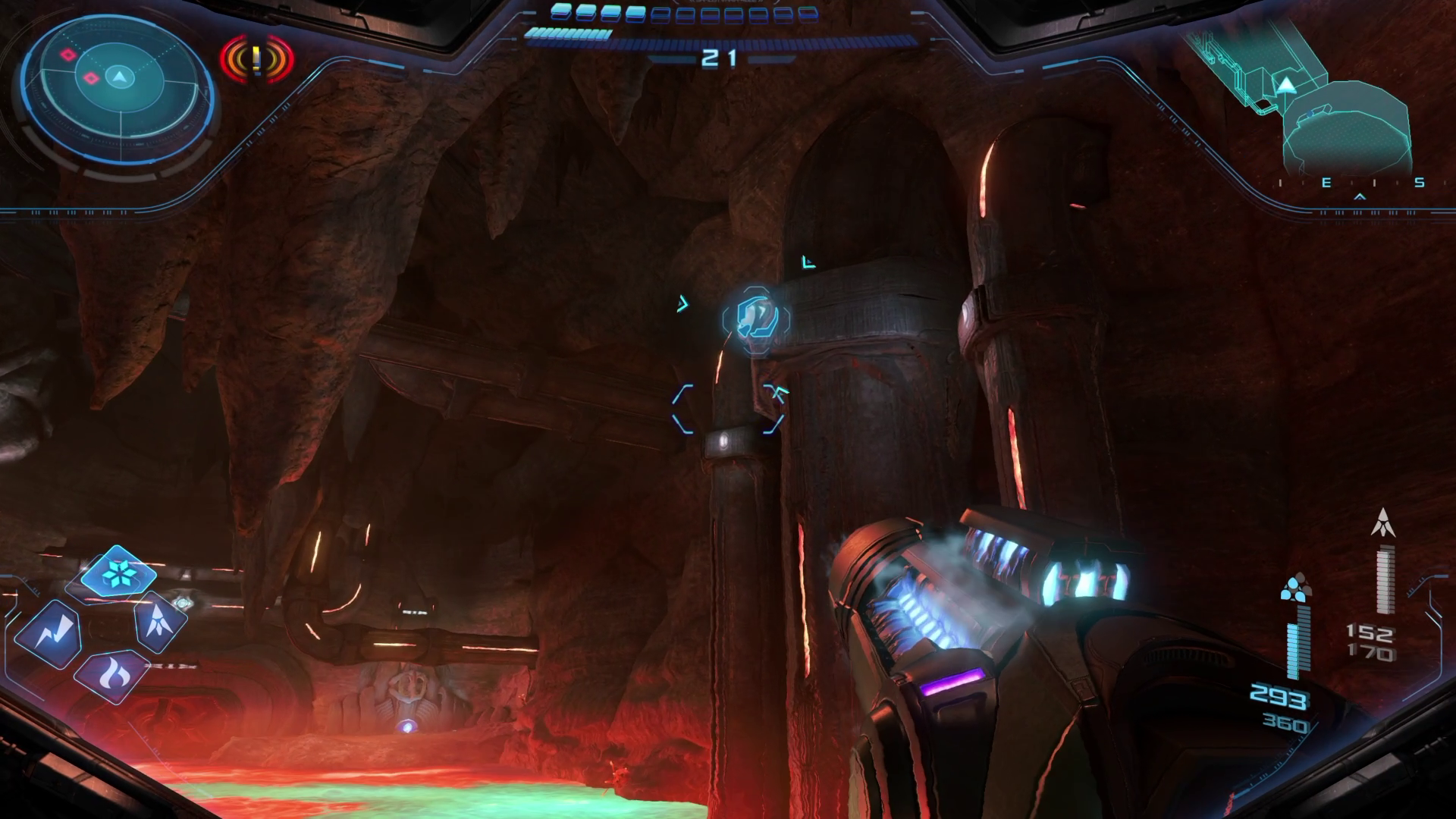 火山に入ってすぐ、スキャンにすると右側に可視化できる足場があります。その先を登っていくとミサイルタンク。