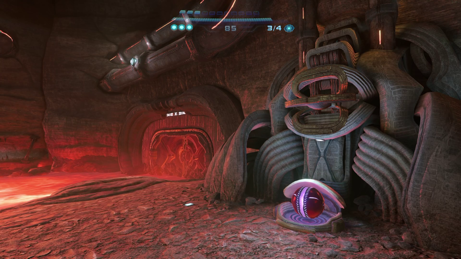 ボール状態でダッシュできるようになったら、火山の入口のすぐ右側でボール状態でダッシュすると飛ばされます。飛んだ先にラージショットタンクが落ちているので回収しましょう。その先のラモンの石像をスキャンすると世界観の説明してくれます。