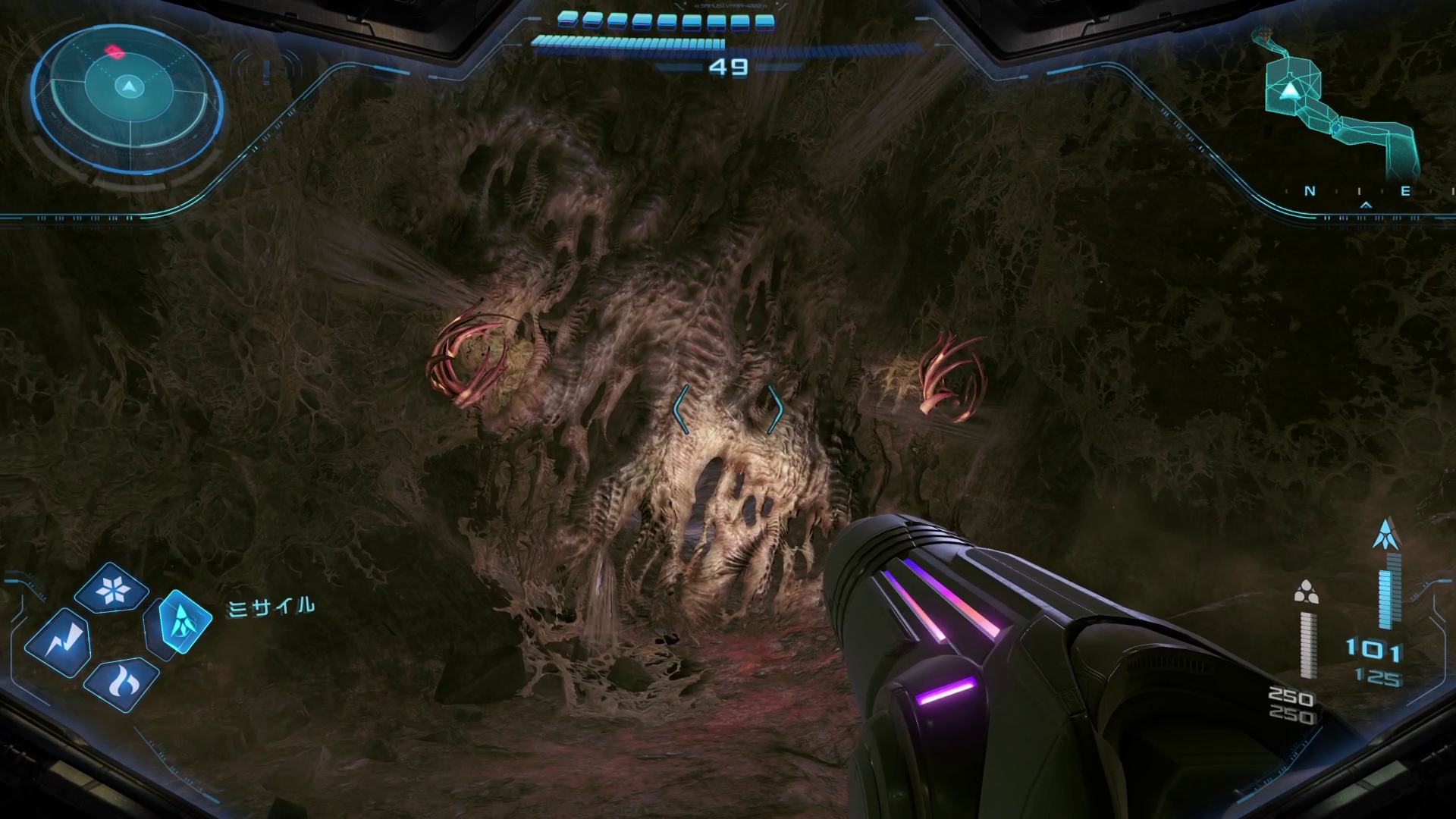 第一層に入ってすぐのシャフト。スパイダーで登った後、ジャンプしてぐるっと裏手にまわります。最後は点滅してるスパイダーに出るので、タイミングよくジャンプしましょう。