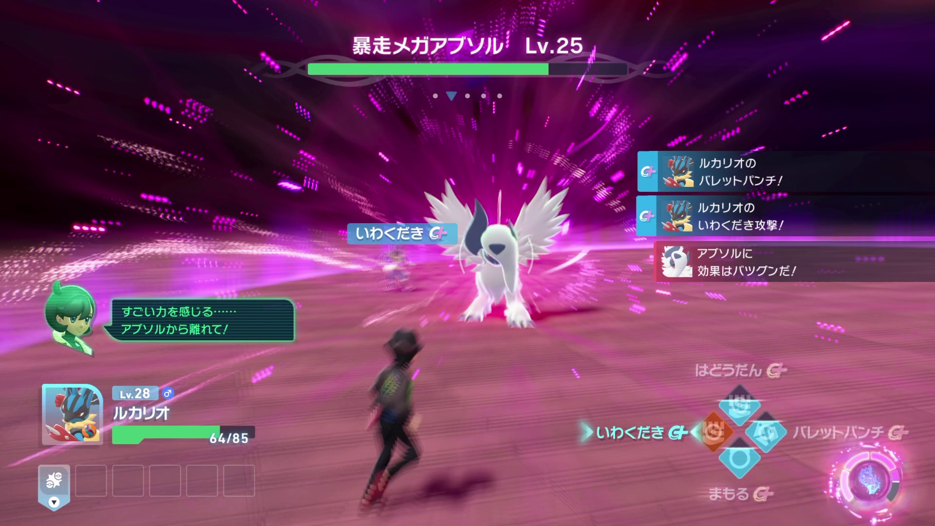 メガアブソル戦に限りませんが、暴走ポケモンと戦うときには基本的にこちらもメガシンカで応戦する必要があります。メガシンカしていないと相手の体力をほぼ減らせないので、いかにメガシンカをして攻撃を当てていくかが大切です。