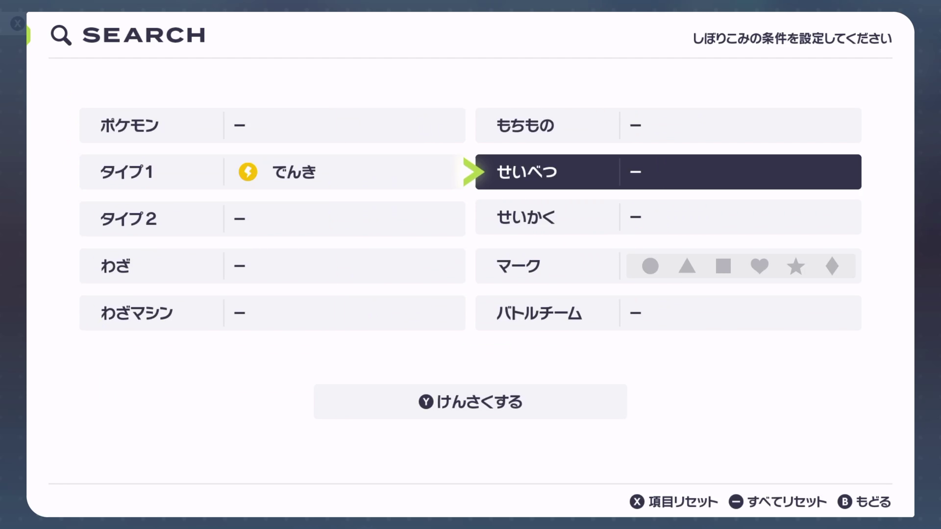 でんきタイプのポケモンを探すときは上記画像のようにするとすぐ探せます。ボックスから。