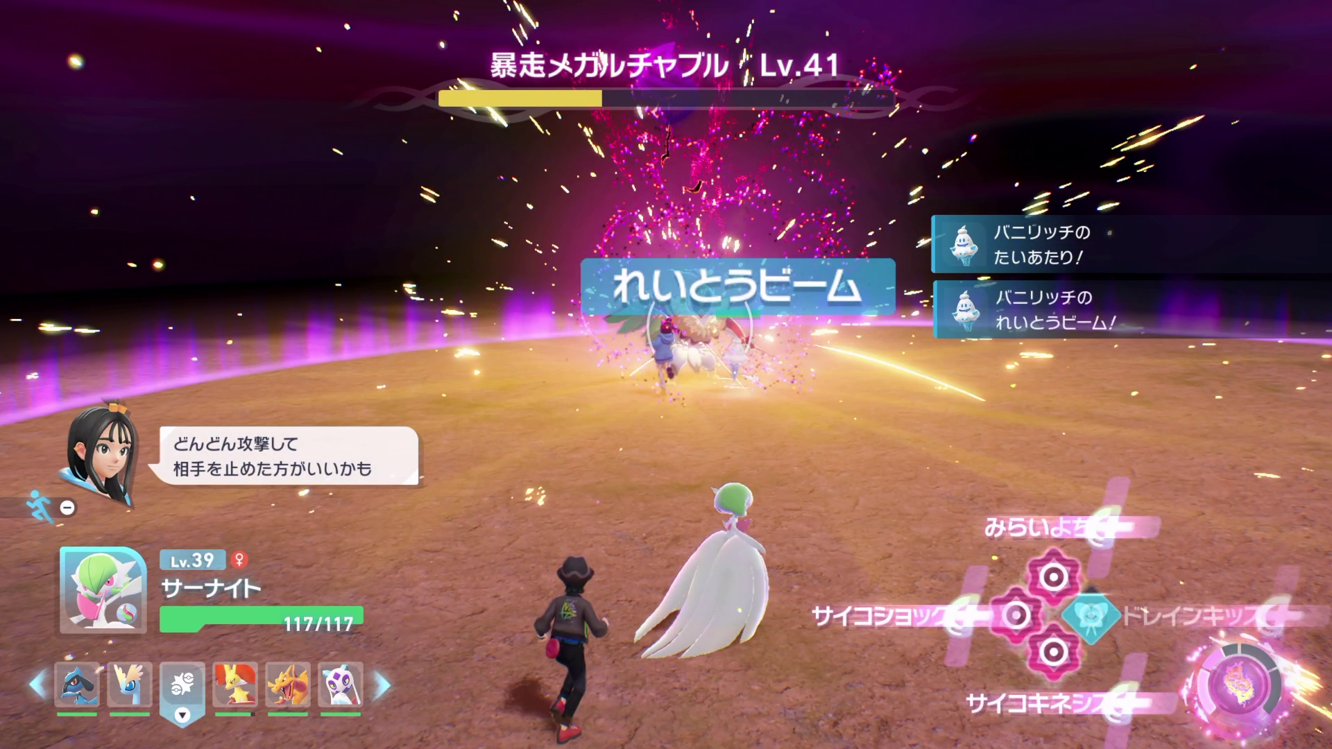 エスパー・フェアリー弱点なので、タイプ一致で攻めることができるメガサーナイトがおすすめ。もちろん弱点がつければ他のポケモンでも問題ありません。
