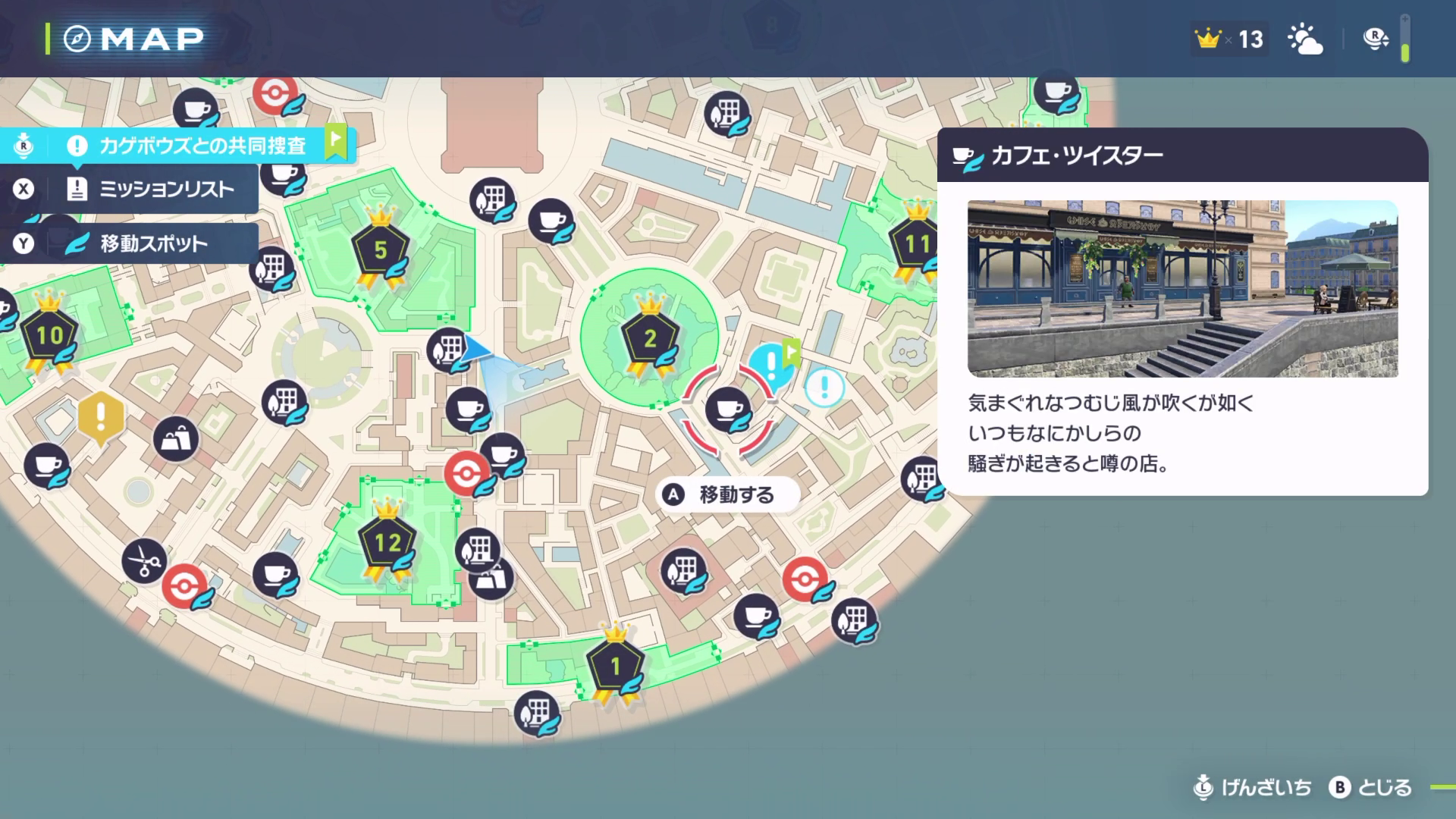 ワイルドゾーン7か15のカゲボウズを捕まえてみせたあと、カフェツイスター近くに移動するので、ファストトラベルで移動して顛末を見守りましょう。