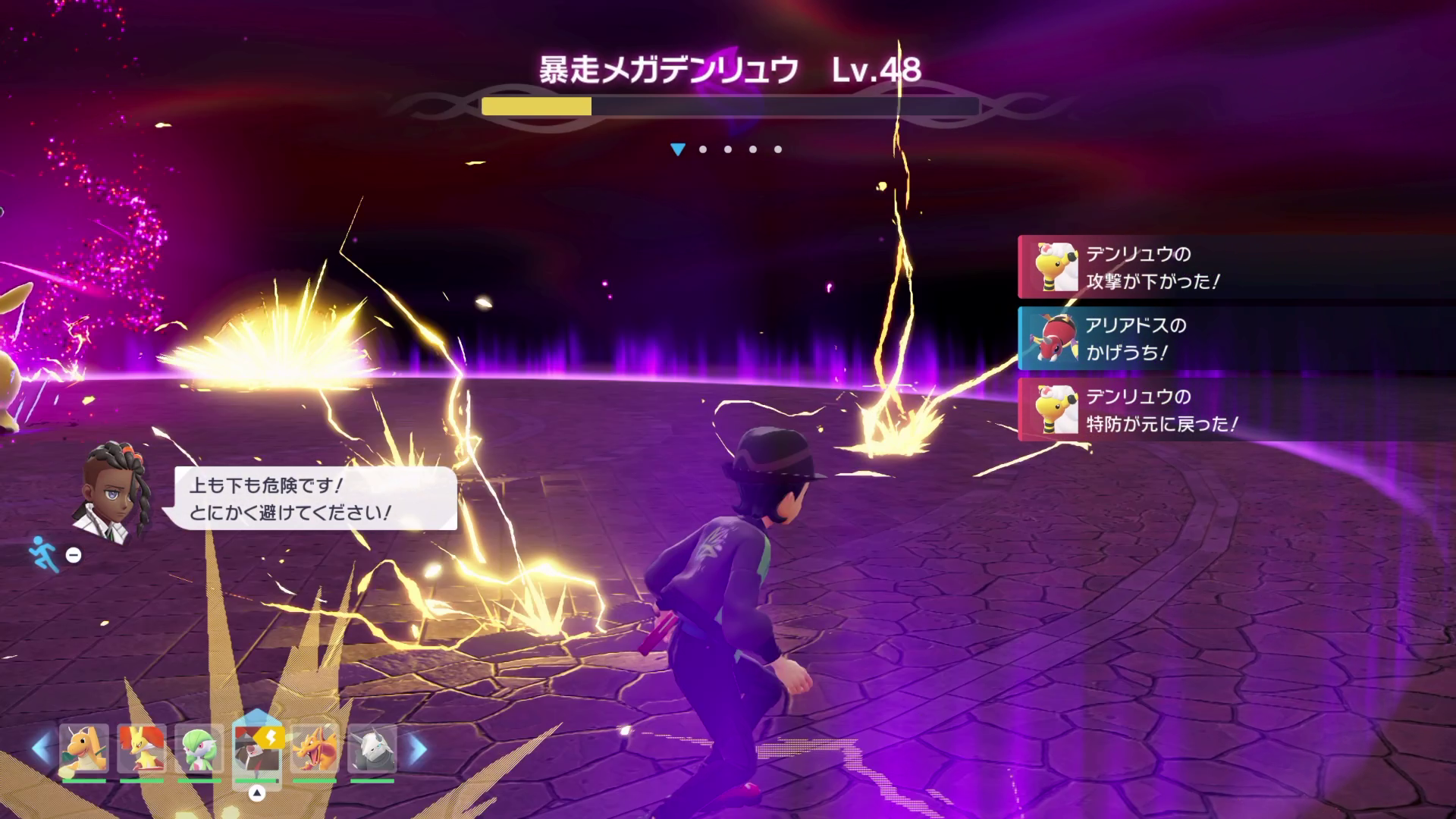 メガデンリュウの大技はかみなりが周囲に落ち、落ちたあと電流が地面を走ります。電流の速度自体は大した速さでもないので、見ていれば特に避けるのには問題ないですが、上からのかみなりとのコンボにだけ注意。