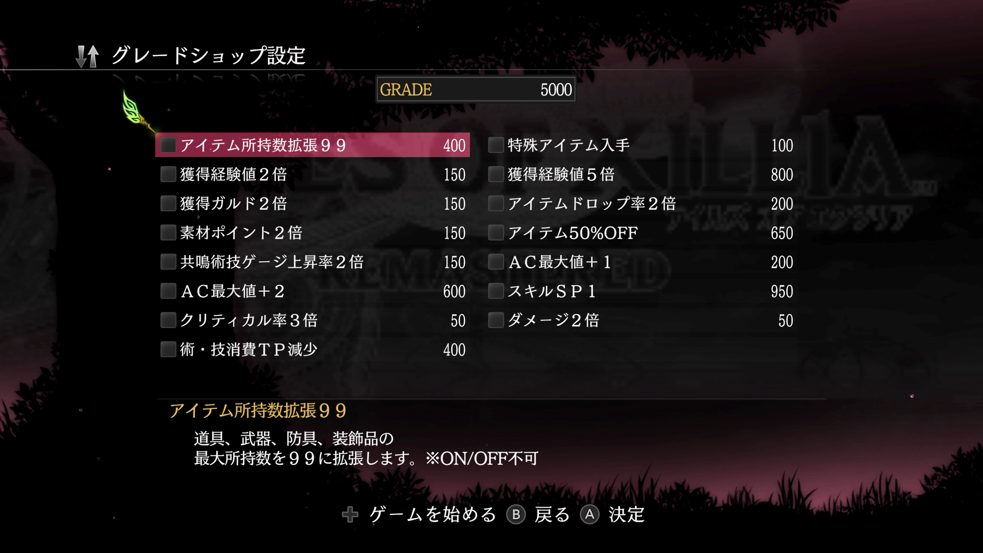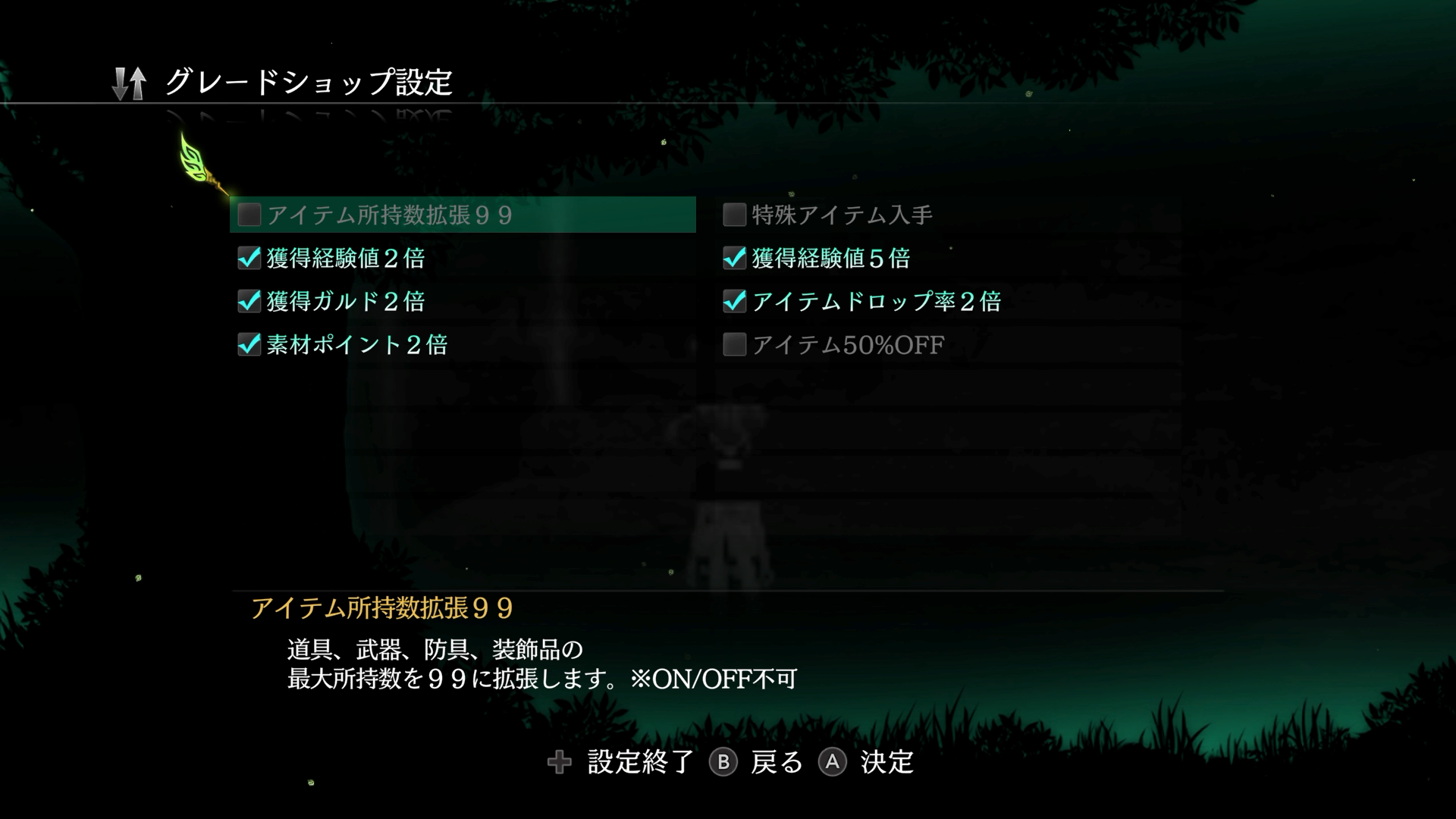 その他に関しては、本作のショップは素材を投入して強化していくのですが、お金も足りませんし、快適なプレイという意味でドロップ率や素材ポイントを強化し、かつアイテム50%オフでお金を使っていくのがおすすめです。オリジナル版で不満がややあった部分でもあるので(人によるかも)、この辺りの改善点として個人的にはつけておくのがおすすめ。