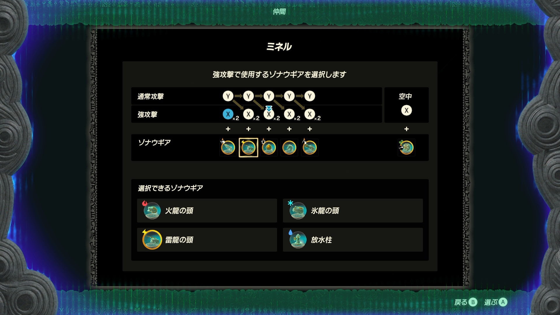 Y→Xは二段目までありますが、使ったり使わなかったり。実際二段目もかなり強く、ヒノックスとかボスボコブリンとか図体でかい相手だとゴリゴリ属性溜まっていくので、この辺りは臨機応変に。