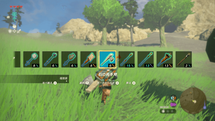 順当に進めていると、中央ハイラルから北西、リトの村方面に向かっていると、途中にボックリンがいるはずです。どうやら木を怖がっているようで、斧や火を駆使して倒してあげましょう。倒すとコログの実を要求してきます。ポーチ拡張に使うので、渡してあげましょう。