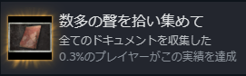 今は画像を見る形式になっています。後々文字もやろうかなとは考え中です(やらないかも)。一応上の実績入手したので全ドキュメントあります。また、ドキュメントはクリア後のサイドを達成しないと100%になりません。
